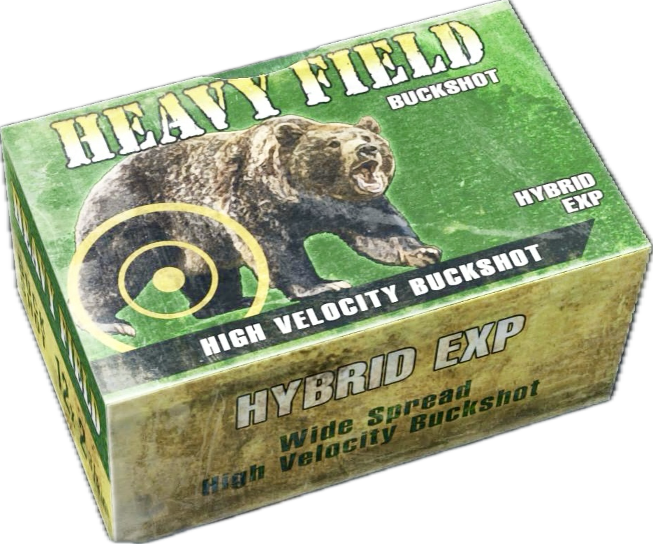 弾薬箱には、大きな熊が咆哮しているイラストと共にヘヴィーフィールドバックショットというタイトル、高速射出散弾や12 x 2 3/4 インチと表記されている