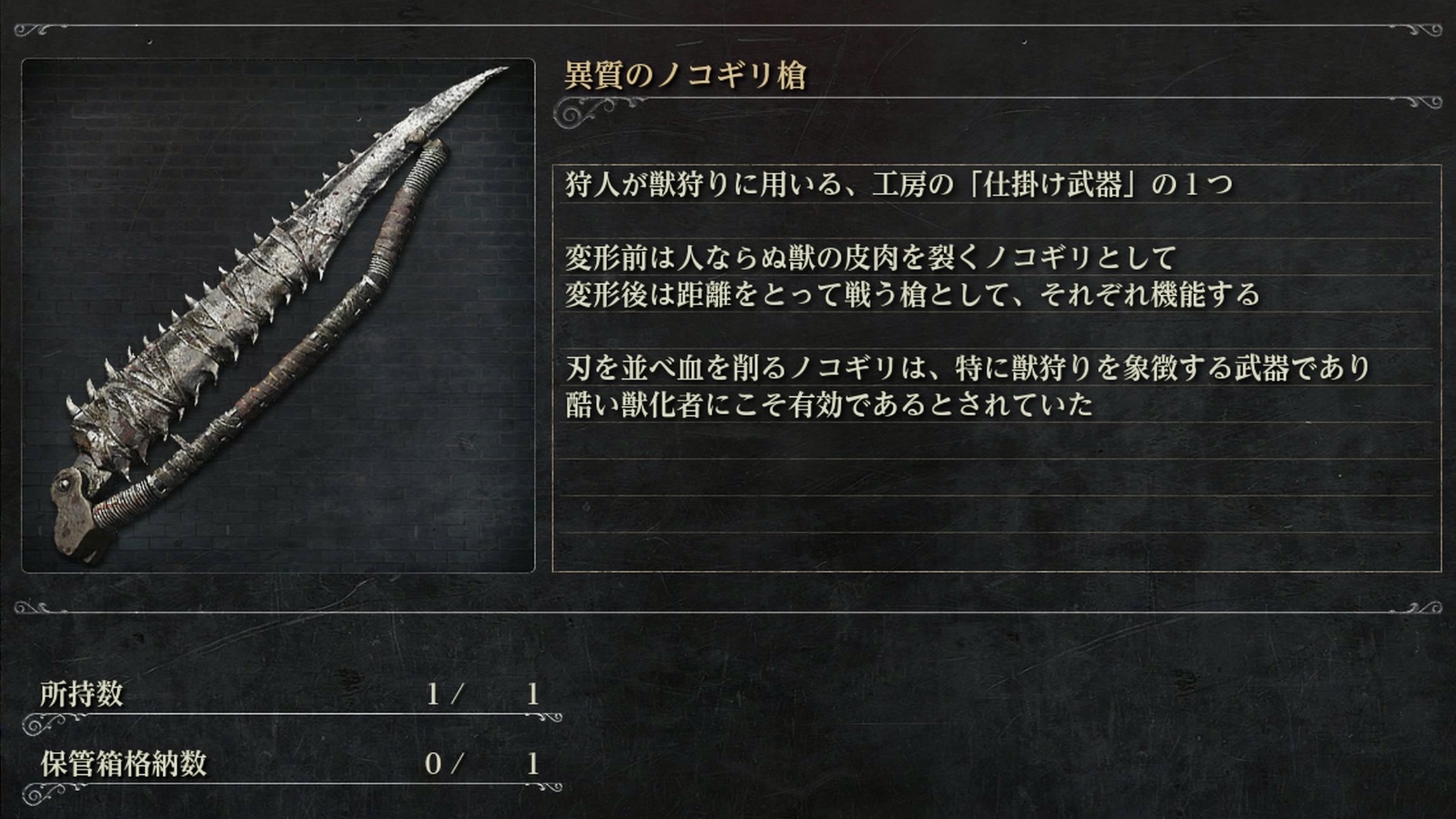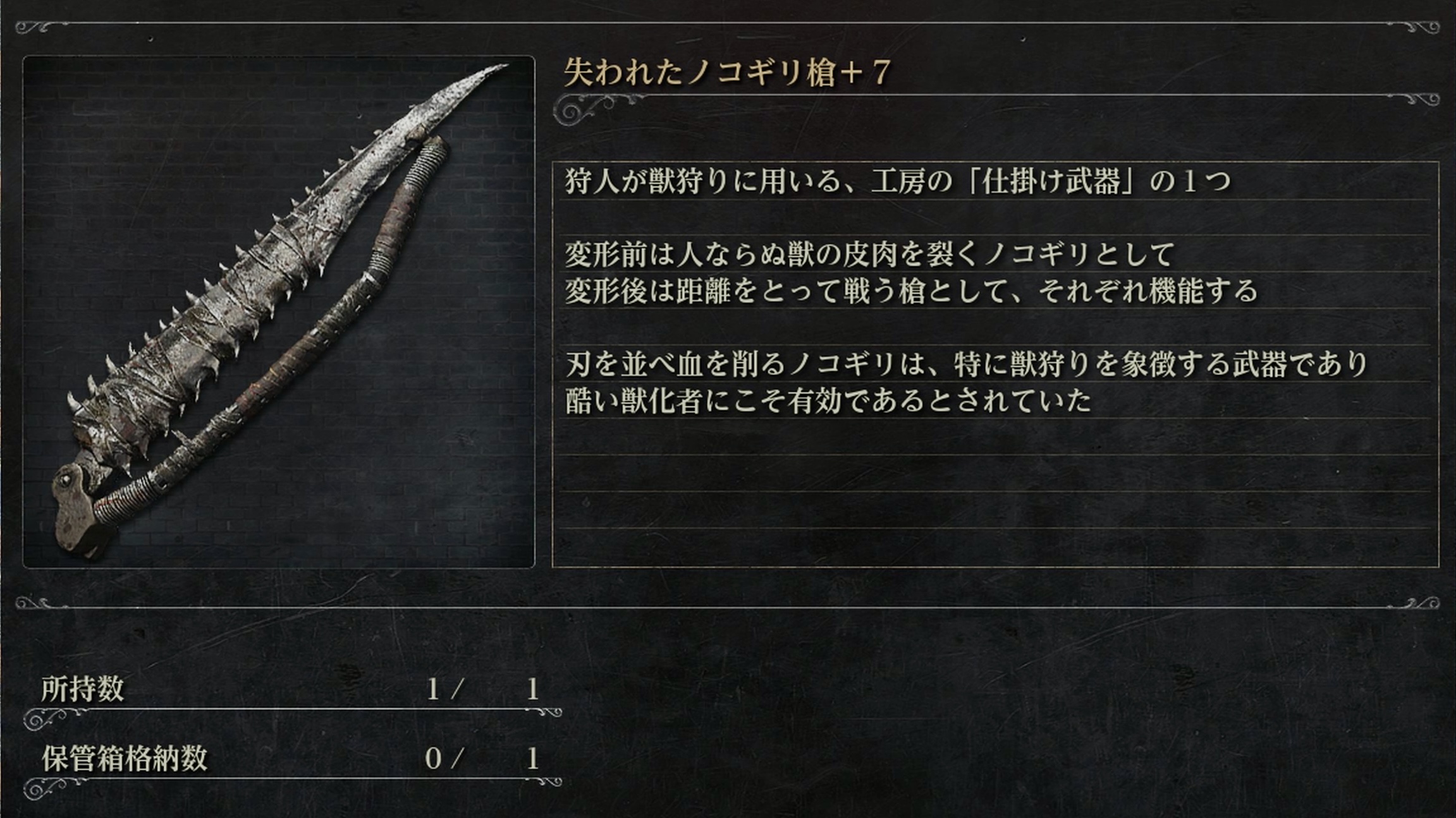 実際のゲームプレイ時には、失われたの異名武器を用いて血晶石で炎属性化、常時ノコギリ特性発動と合わせて、獣キラーとして運用している