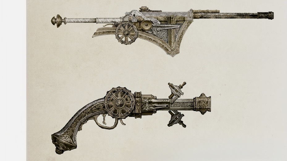 また、獣狩りの銃器はシンプルな装飾の仕掛け武器とは異なり、銃身に装飾部品が取り付けられ、車輪のような部品が側面に取り付けられたものが多い