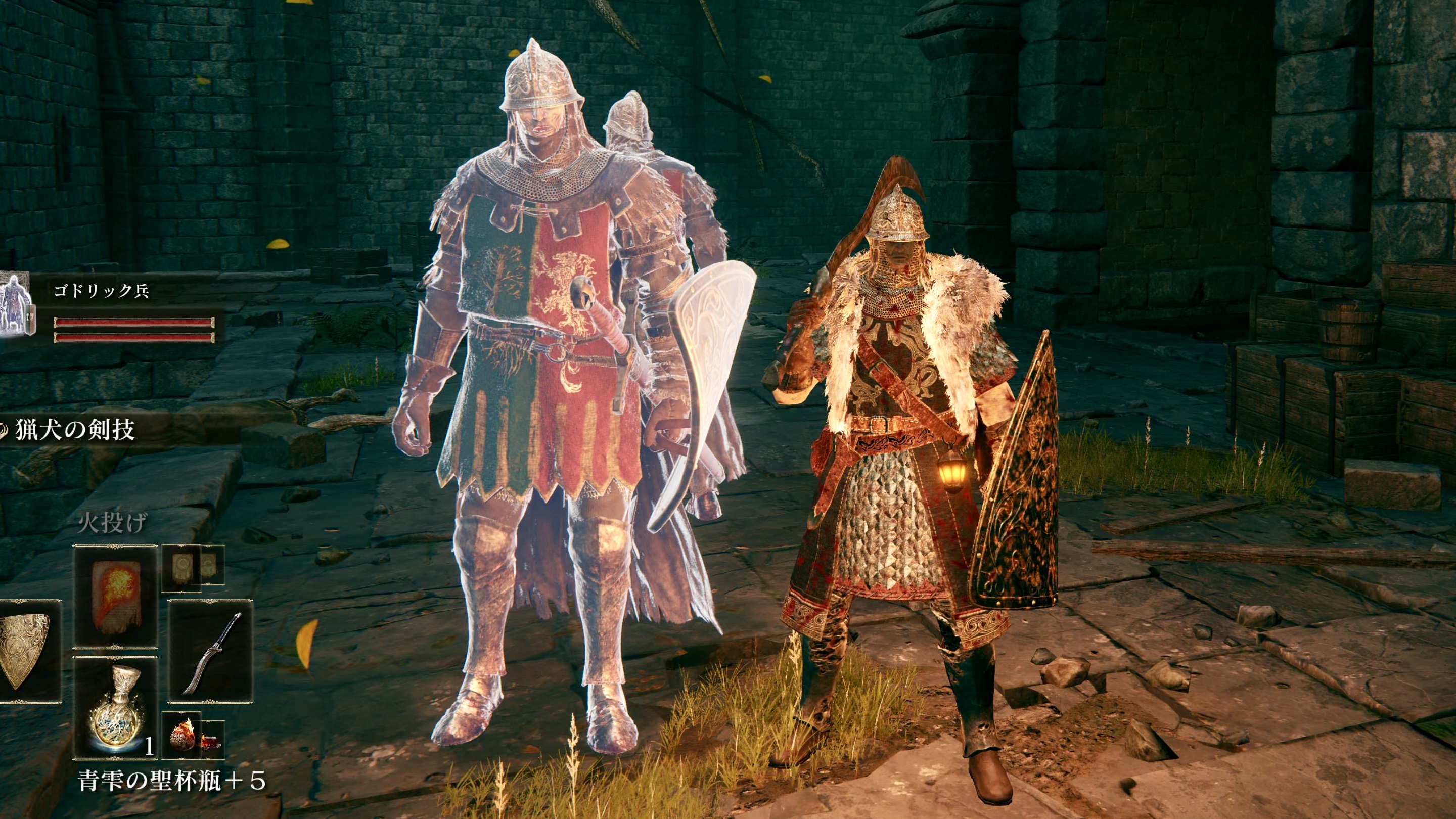 上記の武器の他には、真鍮の盾、ゴドリック兵の兜・手甲・足甲、大樹と獣のサーコートを装着