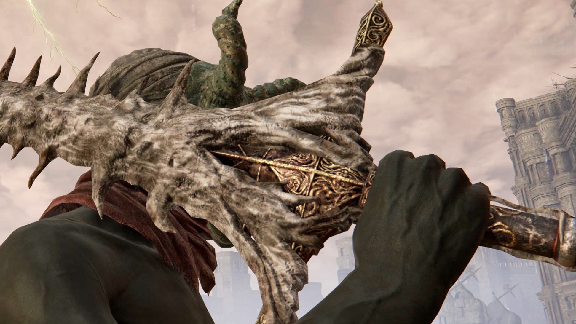 剣の柄部分を注意深く見た時に、柄とグリップ部分は明らかに骨の素材ではない素材で製作された装飾付きの剣の構造体が目視することができ、ミエロスの背骨部分の内側に別の大剣が埋め込まれていると思われる
