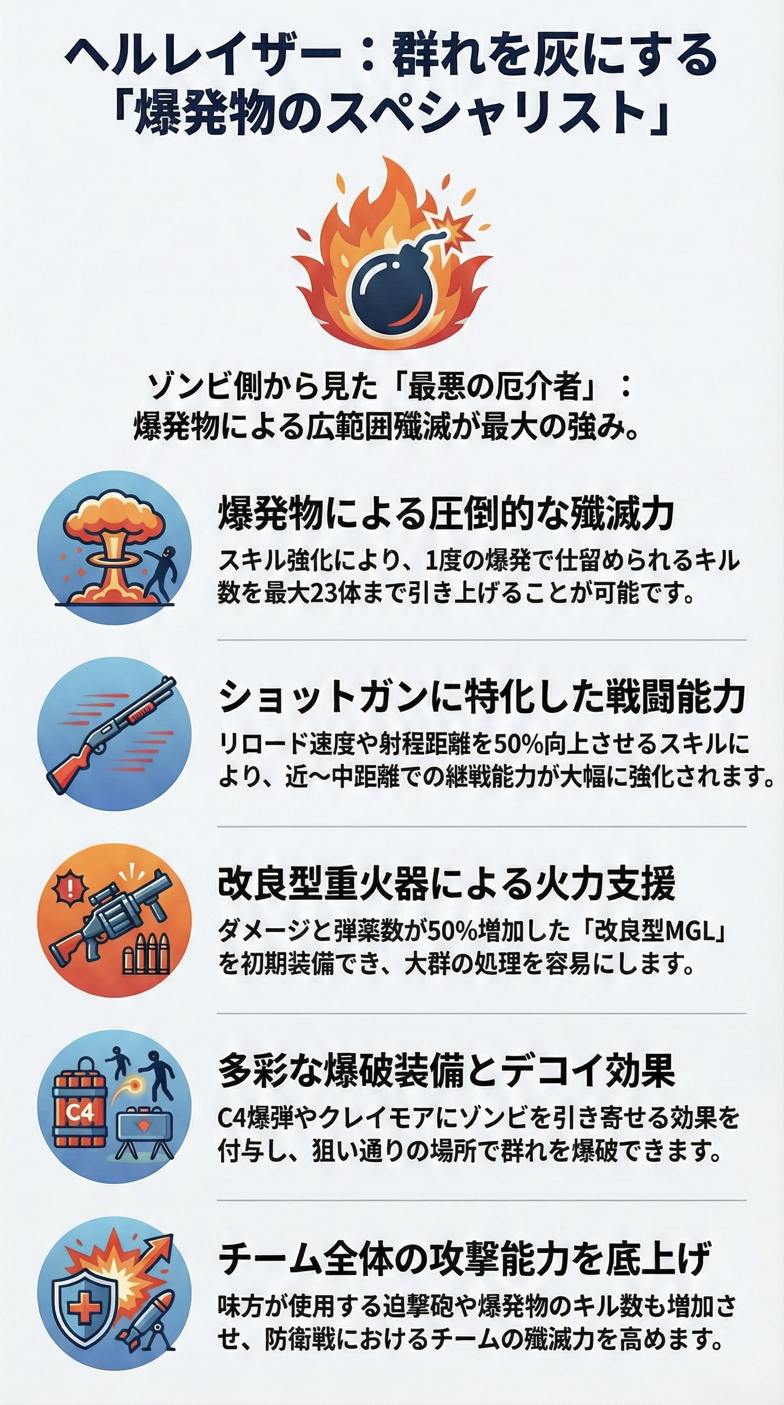 爆発物によってキルされるゾンビは14体が基本となるが、スキルによる強化で23体までキル数を伸ばすことができるため、1箇所に固まったゾンビの群れの殲滅力が非常に高く、大抵のゾンビの山は跡形もなく消えることになる。