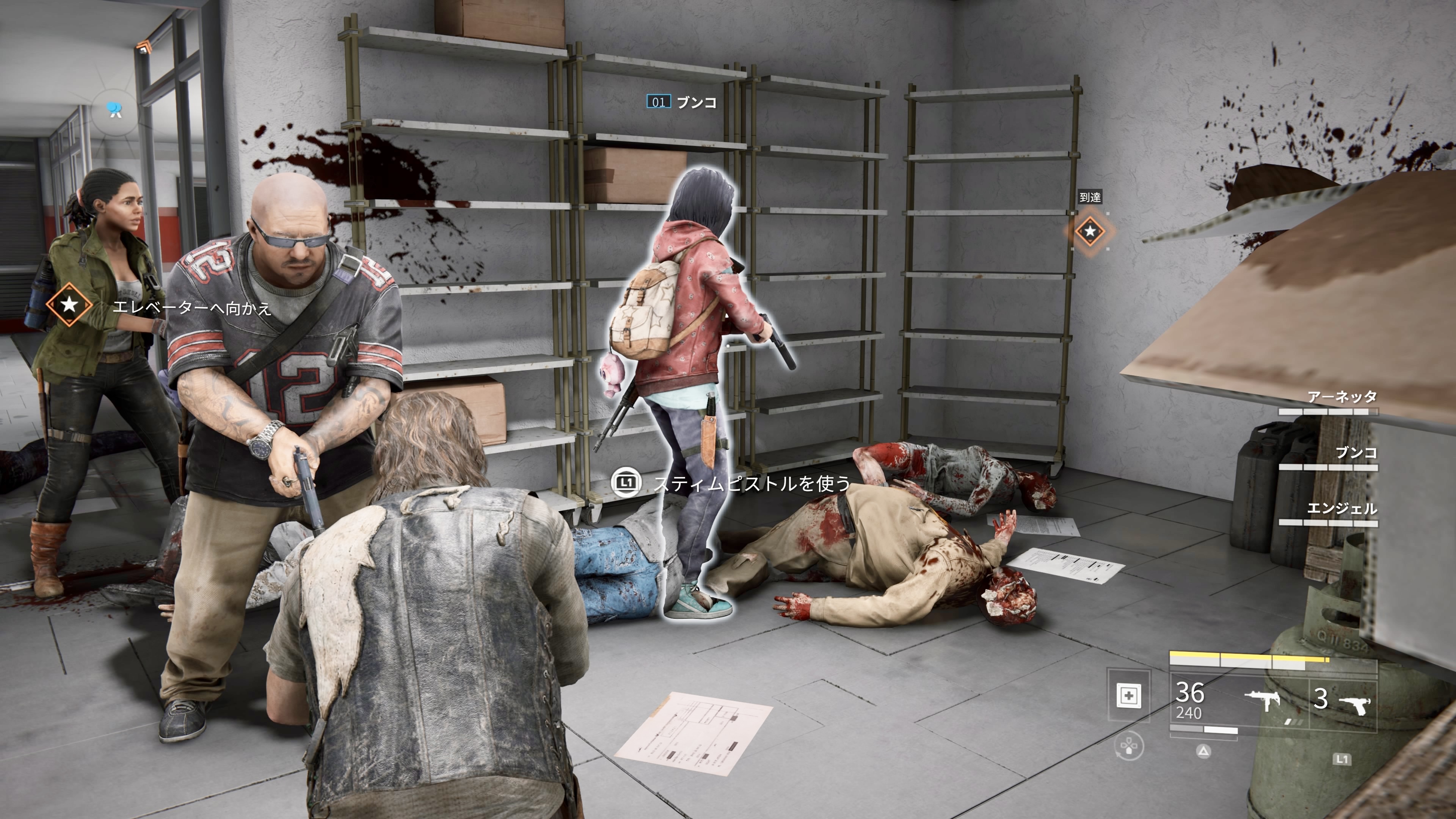 装備ボタンを1回押し込むと、プレイヤー自身にピストルの弾薬を打ち込み、ヘルスブーストがかかる