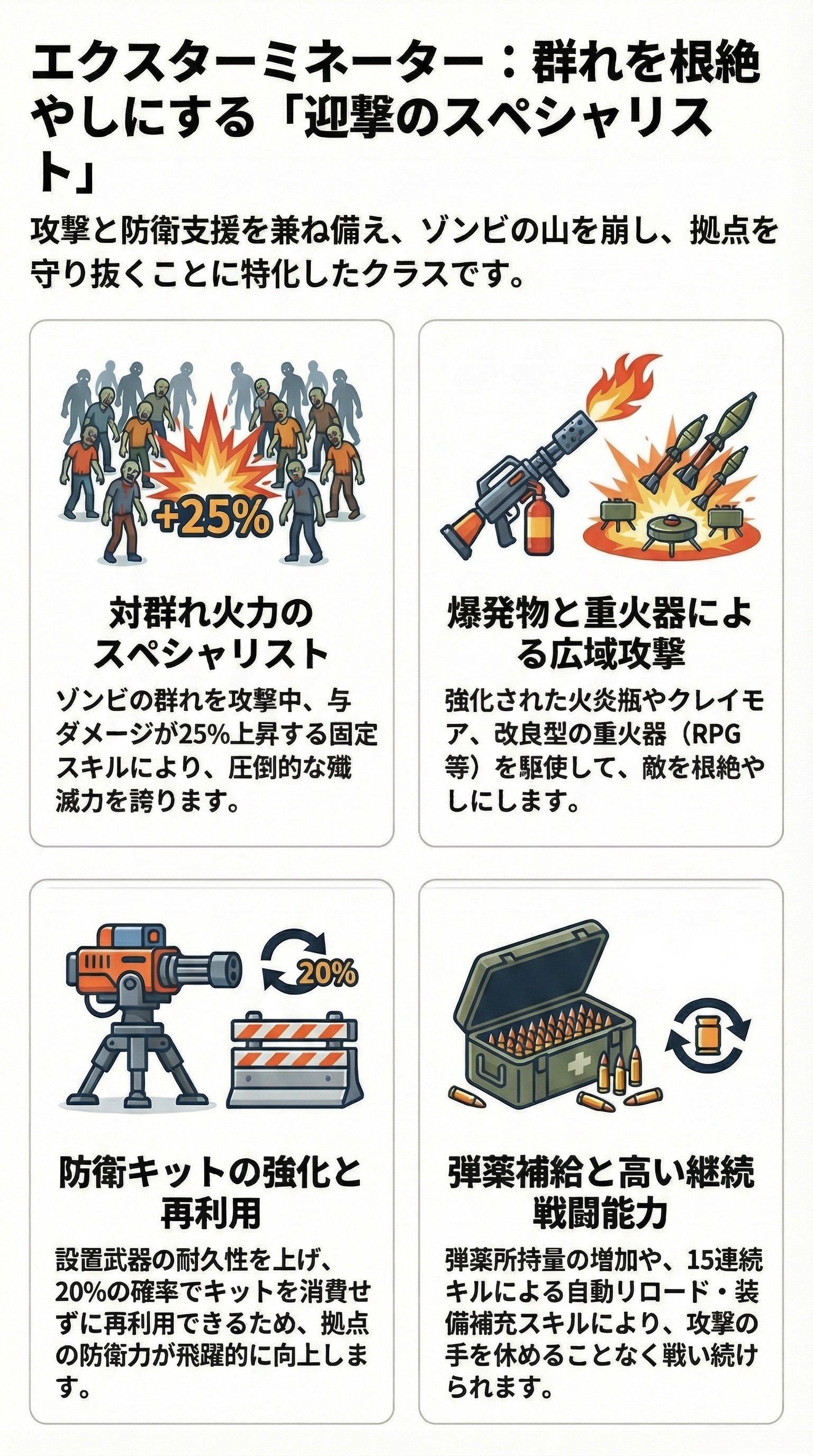 他クラスにはない、ゾンビの群れに対抗する迎撃特化スキルがあるのも特徴的